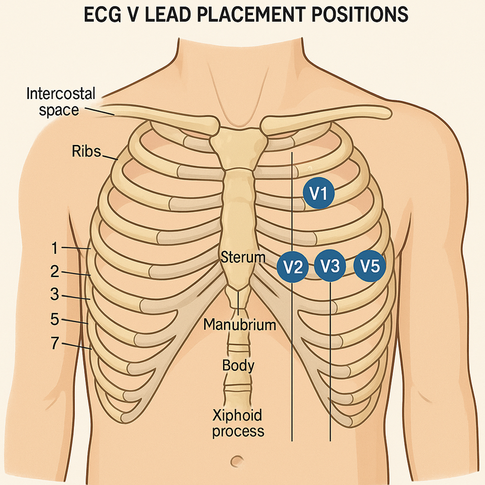 5-Lead ECG Placement Made Easy: A Step-by-Step Guide with Diagrams Posted by Philip on 22nd Sep 2025 Electrocardiogram (ECG) placement is an elemental skill required in clinical practice. Proper electrode positioning ensures accurate readings, which are crucial for diagnosing heart conditions. Understanding the step-by-step process of 5-Lead ECG Placement is vital. While initially seeming complicated, it becomes straightforward with the proper knowledge and techniques. Studies show that misplacing electrodes, especially V1 and V2, can happen in a significant number of cases, up to 45% of women and 29% of men. Considering this, one cannot stress enough the importance of correct landmarking to avoid inaccuracies. We’ll walk you through each stage, ensuring you can confidently place the leads and avoid common errors. By the end of this guide, you’ll learn about the critical aspects of 5-Lead ECG placement, enabling you to provide reliable ECG readings in your practice. What Is an Electrocardiogram (ECG)? It is a medical test used to measure the heart's electrical activity. It keep track of the timing and strength of electrical signals as the heart beats. ECGs help diagnose various heart conditions, such as arrhythmias, heart attacks, and heart disease. During the procedure, electrodes are placed on the skin to capture the heart’s electrical impulses. For accurate readings, proper placement is crucial. The 5-Lead ECG placement method is often used in hospitals and clinics to monitor heart activity. Additionally, guidelines from organizations like the AHA and IEC ECG placement provide standardized electrode positions. ECG electrode color coding ensures that each electrode is placed correctly for optimal results. Understanding these fundamental concepts is essential for clinicians and patients to achieve accurate heart monitoring. How Does an ECG Work? An ECG detects the electrical impulses that trigger heartbeats. These impulses lead to the heart muscle contracting and pumping blood. Electrodes attached to the skin detect these electrical signals as the heart goes through its phases of depolarization and repolarization. The depolarization wave represents the contraction of the heart muscle, while repolarization indicates the relaxation phase. Continuous monitoring with a 5-Lead ECG placement allows for real-time observation of heart activity. The electrodes, positioned adequately according to AHA ECG placement and IEC ECG placement standards, transmit signals to an ECG machine. This machine then visually represents the heart’s rhythm and electrical function. Correct electrode placement, aided by ECG electrode color coding, is essential to avoid inaccurate readings, ensuring effective heart health monitoring and diagnosis. 3-Lead vs 5-Lead vs 12-Lead ECG Comparison ECG systems come in various configurations, with 3-lead, 5-lead, and 12-lead setups offering different views. A 3-lead ECG placement typically monitors basic heart rhythms and is often used in emergency settings or ambulatory care. The 5-lead ECG placement provides more detailed monitoring and is often used for continuous cardiac surveillance. It includes the right arm (RA), left arm (LA), right leg (RL), left leg (LL), and a V lead for better heart activity tracking. The 12-lead ECG offers the most comprehensive heart evaluation, providing detailed views of all aspects of heart function. This setup is often used for diagnosing heart conditions like arrhythmias, ischemia, and infarctions. The configuration choice depends on the clinical need, with 5-lead systems offering a balance of simplicity and accuracy, while 12-lead setups are reserved for detailed assessments. What Is a 5-Lead ECG? The 5-lead ECG is a streamlined method for monitoring the heart’s electrical activity. It uses five electrodes placed on specific body areas: RA (right arm), LA (left arm), RL (right leg), LL (left leg), and a chest electrode. These placements provide a continuous view of the heart’s electrical signals, making it ideal for inpatient and emergency settings. The 5-lead ECG placement allows for monitoring essential aspects of heart rhythm while offering more information than a basic 3-lead configuration. Compared to the 3-lead ECG, the 5-lead setup improves accuracy, especially detecting arrhythmias and other abnormal heart rhythms. While the 12-lead ECG provides the most detailed analysis, the 5-lead system offers a practical solution in clinical settings, combining efficiency and reliability. Color Coding Standards: AHA vs IEC The AHA and IEC have developed standardized color coding systems for ECG electrode placement. The AHA ECG placement system uses a mnemonic to help remember lead placements: "White on right, smoke over fire, and sky over grass"—referring to the RA (right arm), LA (left arm), RL (right leg), and LL (left leg) leads. The IEC ECG placement system uses a "traffic-light" color scheme: red for the right arm, yellow for the left arm, green for the right leg, and black for the left leg. Each color corresponds to a specific placement to ensure consistency and accuracy. These color codes help prevent confusion during ECG electrode setup, providing reliable heart monitoring. Both systems prioritize explicit, simple mappings for clinicians, improving workflow and reducing placement errors in heart diagnostics. Step-by-Step 5-Lead Placement Proper placement of the 5-lead ECG is crucial for obtaining accurate heart readings. Following the correct procedure ensures effective monitoring and minimizes errors. This step-by-step guide deciphers each process phase, from patient preparation to final checks. Accurate electrode positioning helps prevent complications like alarm fatigue and improves the reliability of ECG readings. Let's begin by preparing the patient and setting the foundation for precise ECG placement. Patient Preparation Before starting the 5-lead ECG placement, it’s essential to position the patient correctly. Ensu